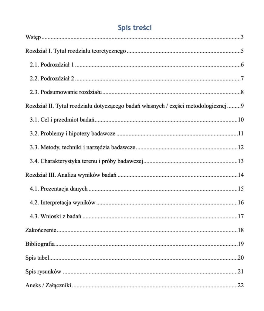 - Podrozdziały – w ramach rozdziałów warto rozbić tekst na mniejsze części, aby ułatwić czytelnikowi nawigację.